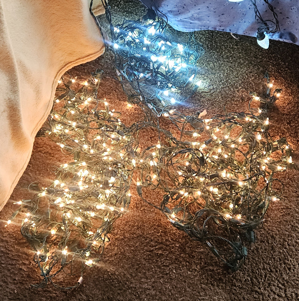 Lot includes various white string lights. Can be used year around. Two strings have a different shade than the other six. One string are plastic bulb lights, versus pin lights & missing one bulb, but the string still works. Additional string light not shown included for extra bulbs. Price is for all. 6632