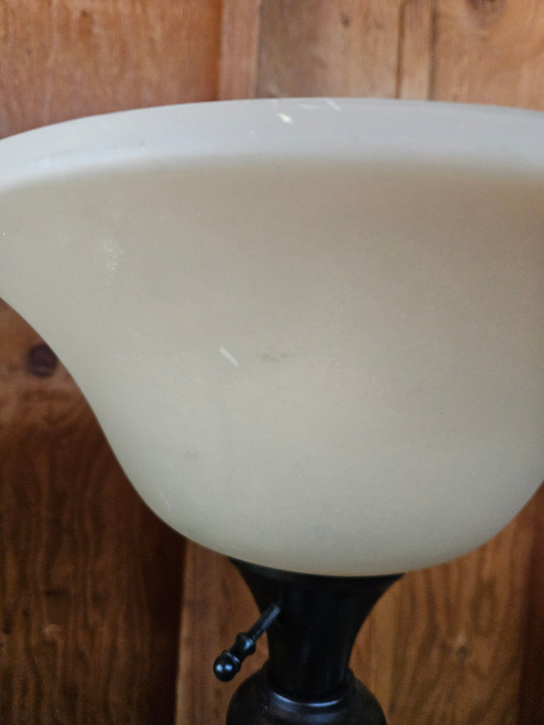 Local pickup only. Base measures 10" across. The plastic ivory shade is 12.5" across. Some wear here & there. 6683-B0009