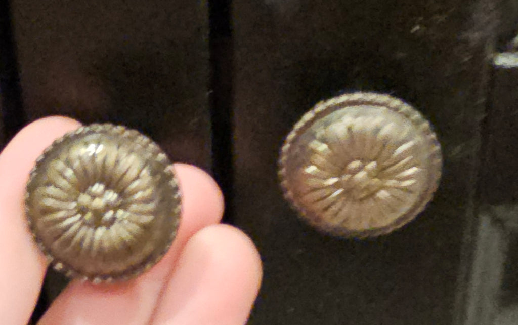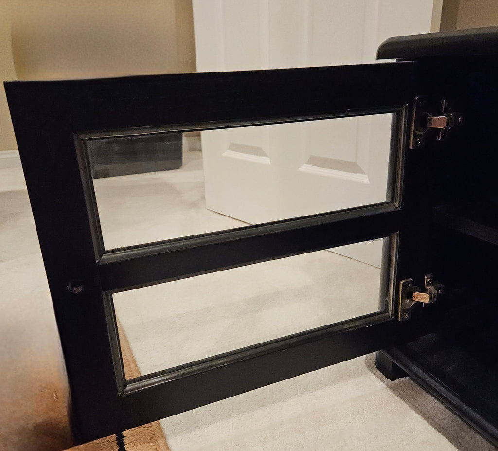 Measures 17.5" deep, 42.5" across & 17.5" tall. Missing a knob on one door. Needs slight cleanup. 6513
