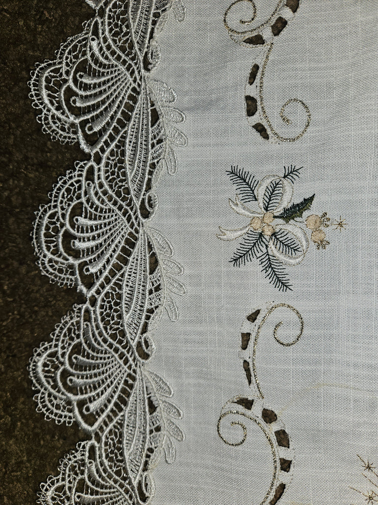 Embroidered cut out all the way around. Measures 17" x 36". Has a few small markings in one corner. See last photo. 6583
