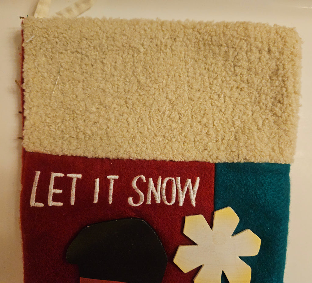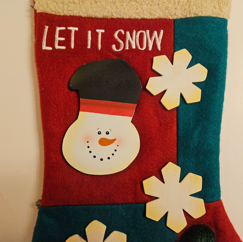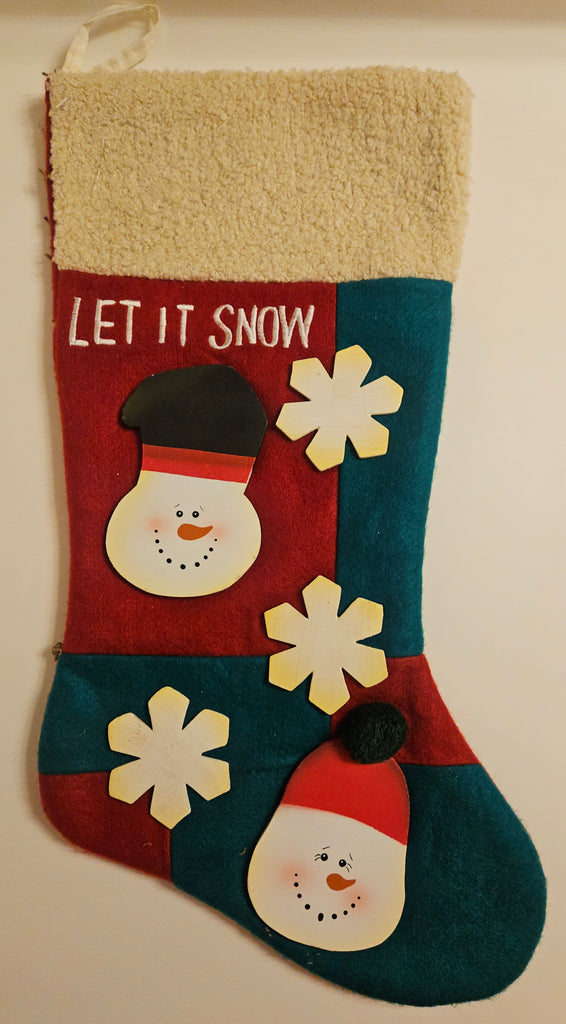 Measures 8 1/2" across at the top & 10" across at the bottom. Approximately 19" in length. Snowman & snowflakes are made of wood. 6614