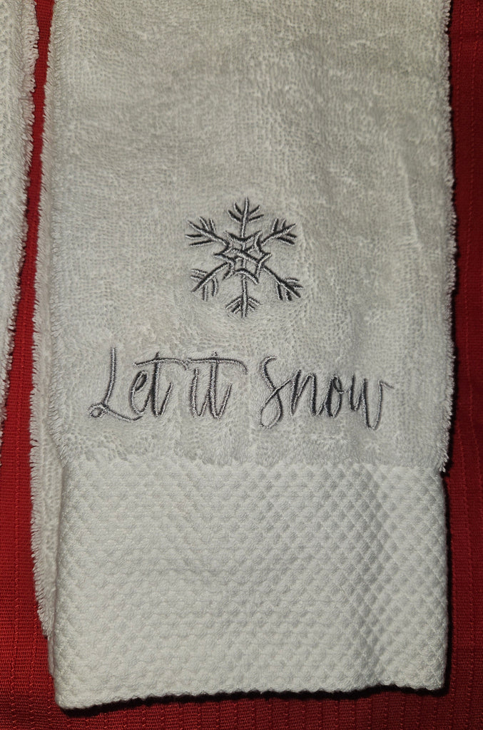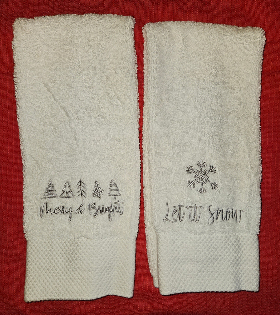 Each towel measures 14" x 30". Includes two towels which read "Let it Snow" & "Merry & Bright".