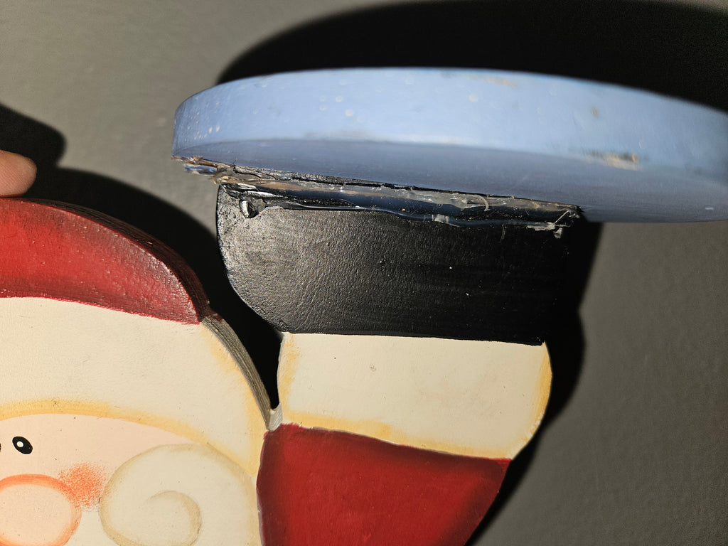 Measures 11" tall & the base is 2 1/2" x 9". There is some wear here & there. It is glued under the circle Santa is holding. 6603