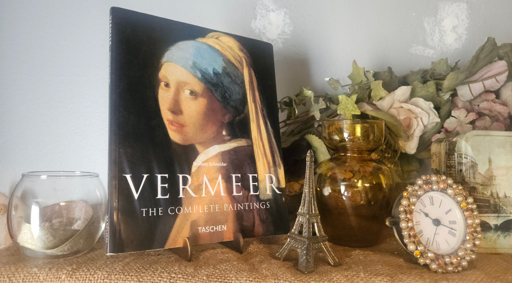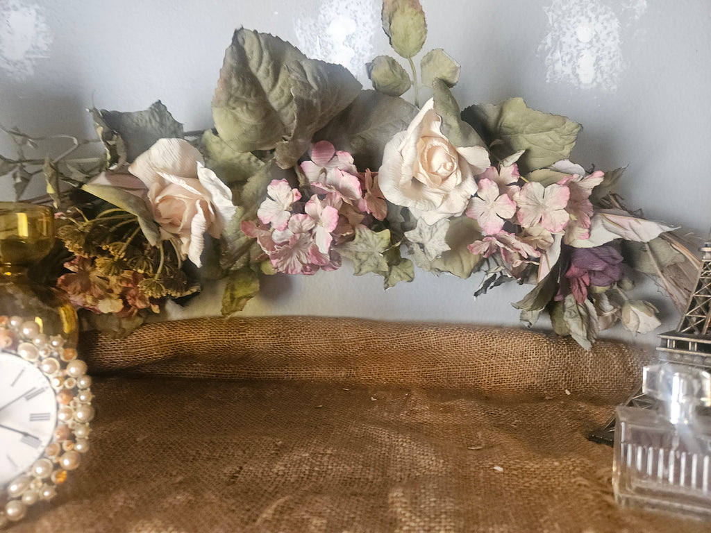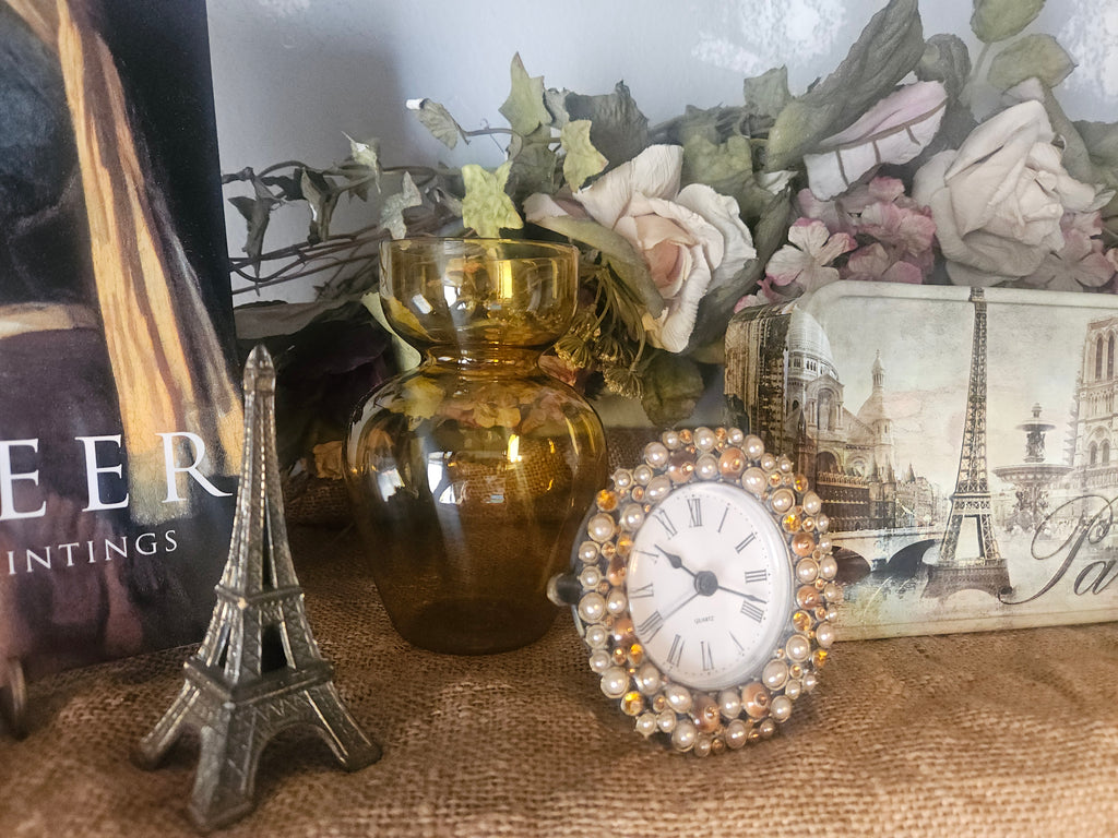 All shelf contents in one shop. Includes; (2) small round glass candle holders w/ ribbon, green picture frame, 13" metal Eiffel Tower, 4" metal Eiffel Tower, approx 30" across floral arrangement, small perfume bottle, Paris tin container (2 1/2" x 5" x 8"), working round jeweled clock w/ battery, yellow glass vase, Vermeer book & book/plate stand. 6450