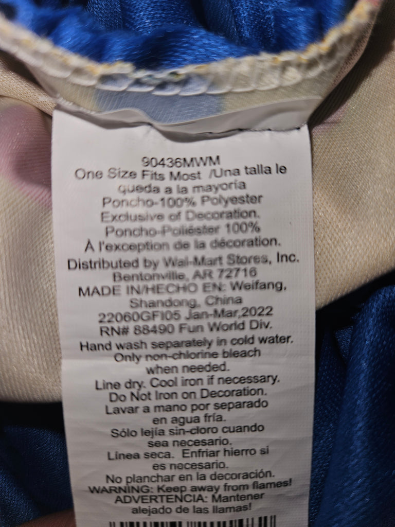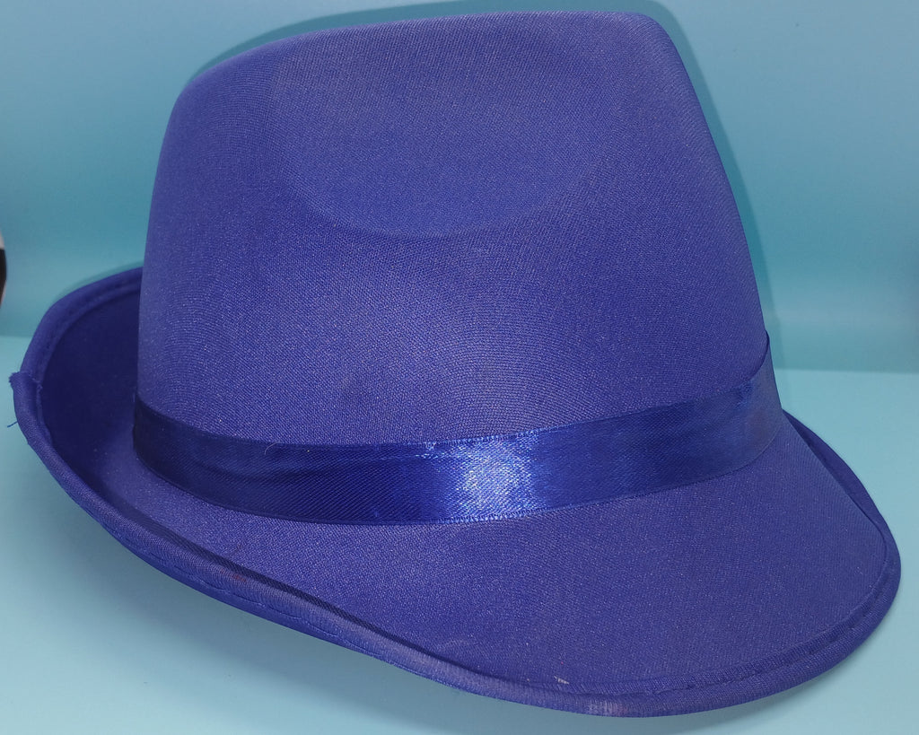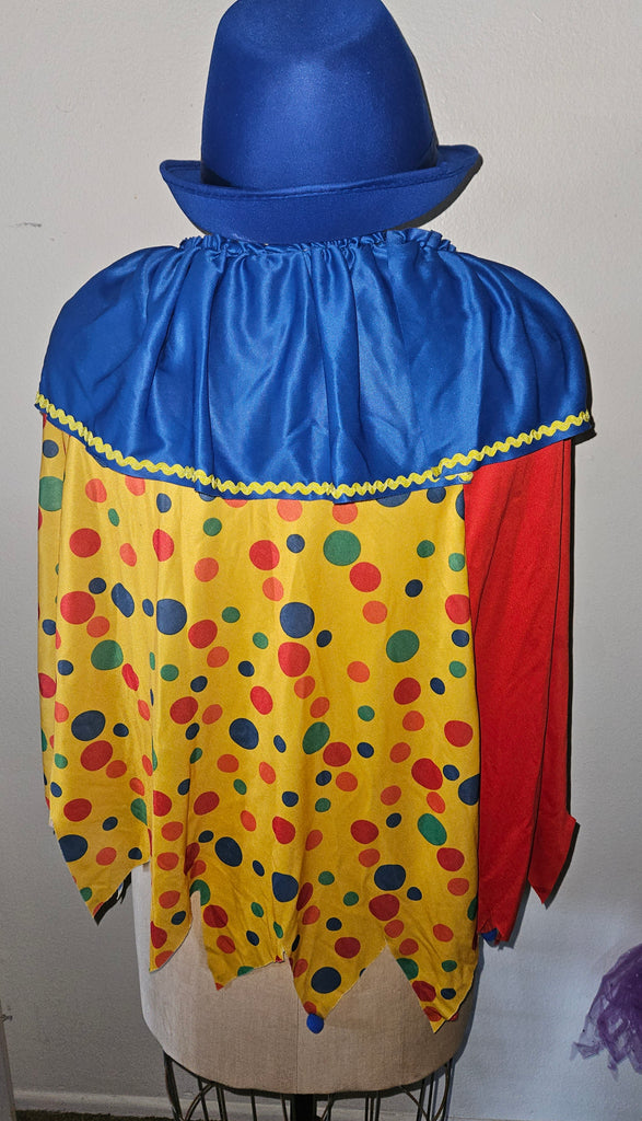 Colorful long clown shirt, blue fedora hat and horn. 8338